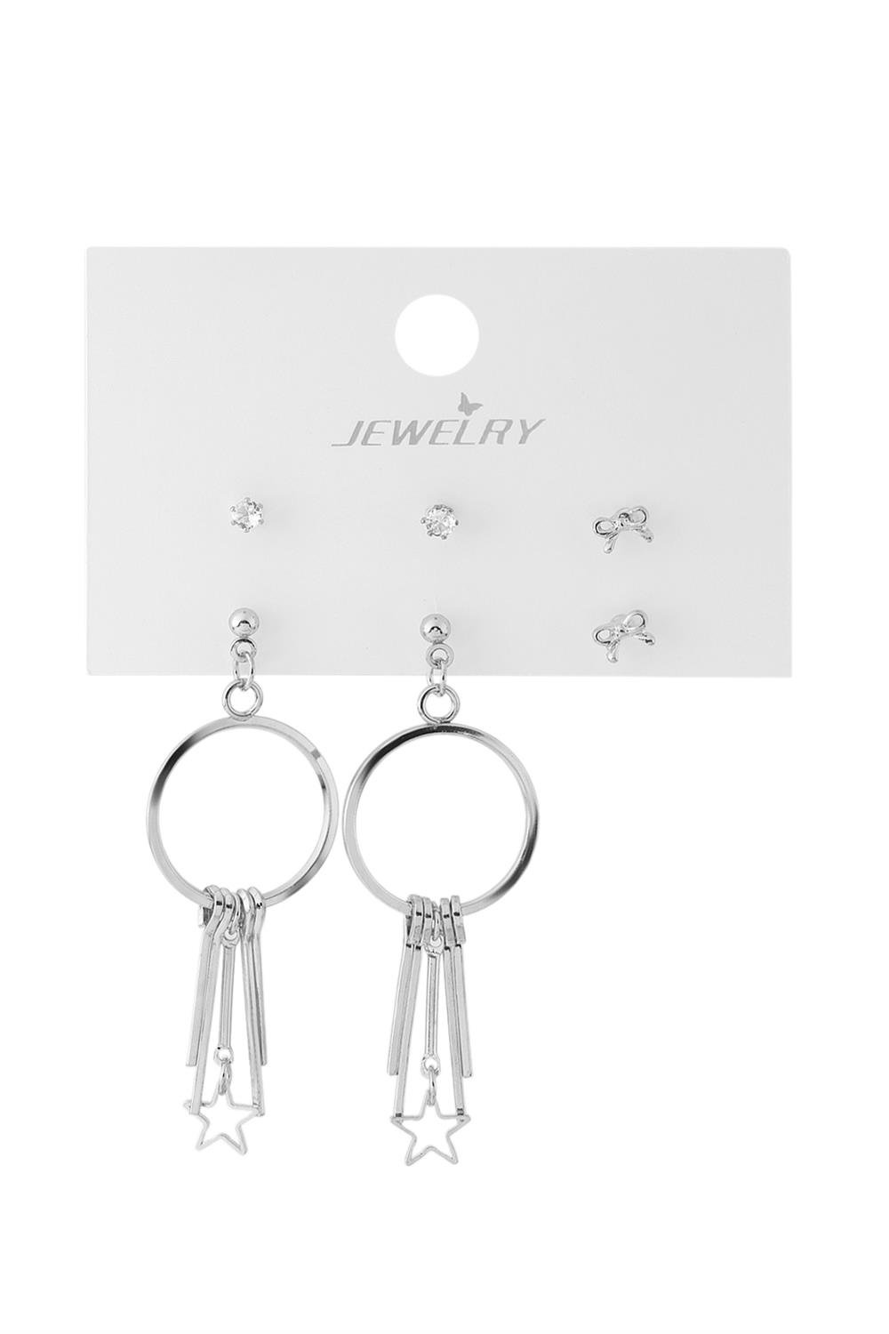 Gümüş renk tasarıma sahip halka ve yıldız detaylı bijuteri küpe seti, farklı stilleri tek sette bir araya getirir. Set içerisinde sallantılı halka küpe, minimal taşlı küpe ve fiyonk figürlü küpe modelleri bulunmaktadır.
