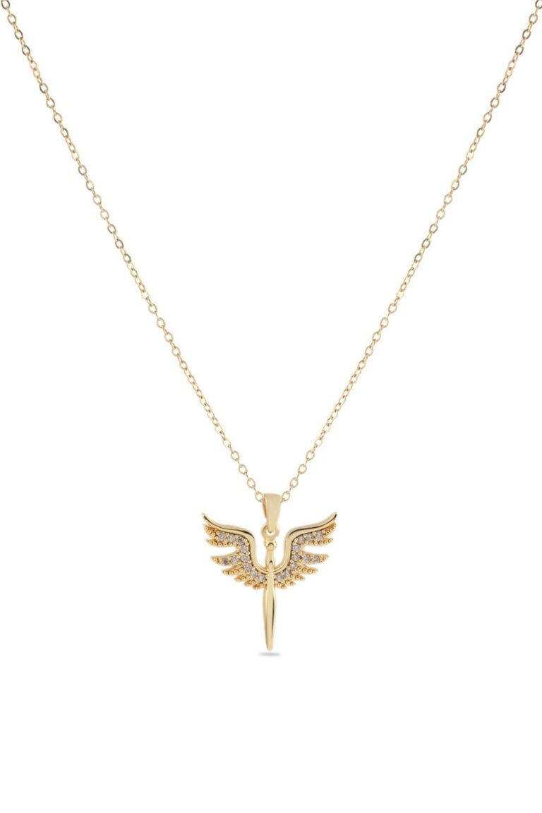 Kırmızı Taşlı Kanatlı Melek Figürlü Gold Renk Çelik Kolye