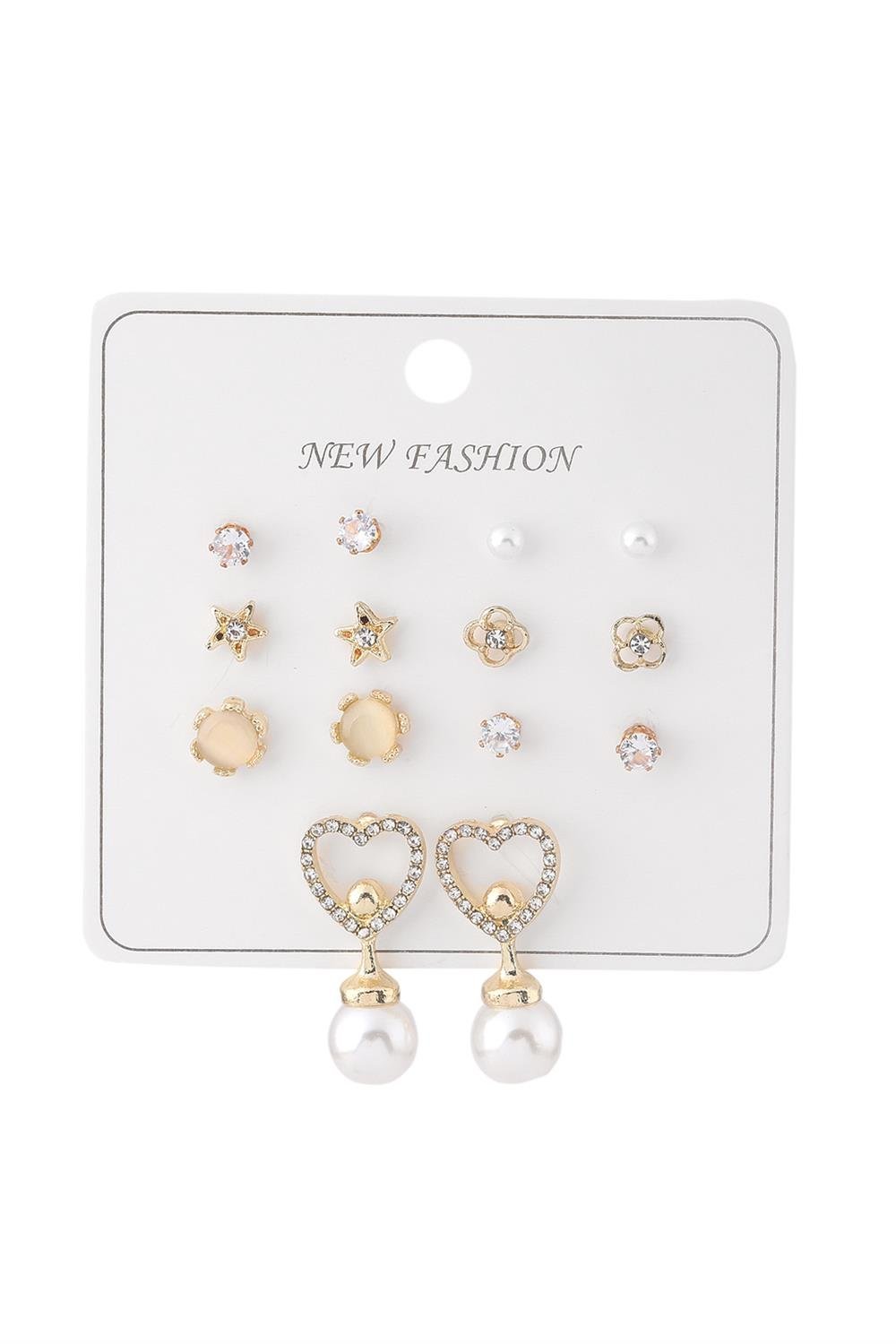 Kalp ve İnci Detaylı Gold Renk Bijuteri Küpe Seti