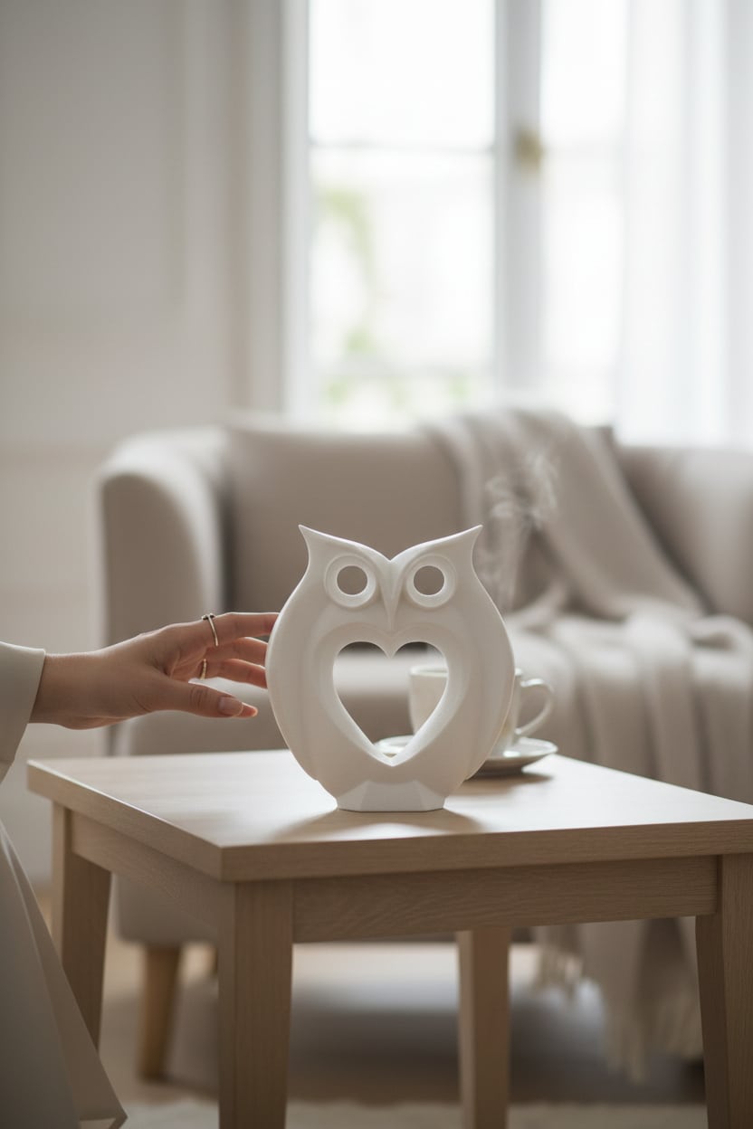 Kalp detayıyla tasarlanmış baykuş figürlü bu dekoratif biblo, sevimli ve anlamlı görünümüyle yaşam alanlarına sıcak bir dokunuş katar. Masa, raf veya vitrin üzerinde sergilemek için uygundur. Dekoratif kullanım ve hediye için idealdir.