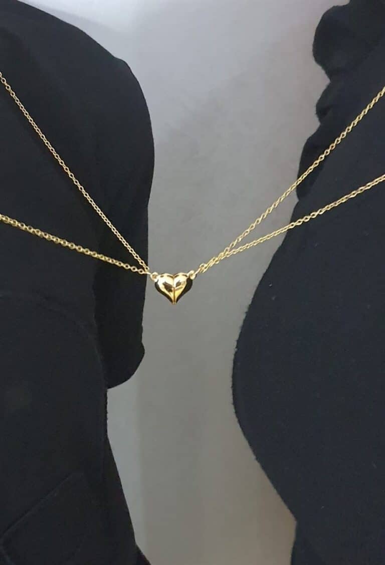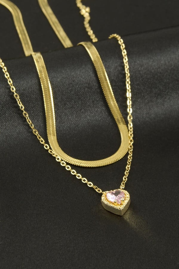 Zirkon Taşlı Kalp Figürlü Gold Renk İkili Paslanmaz Çelik Kolye Seti