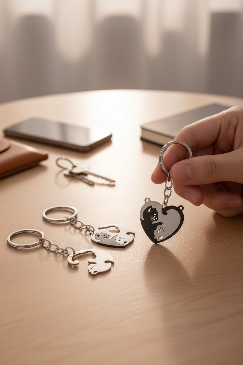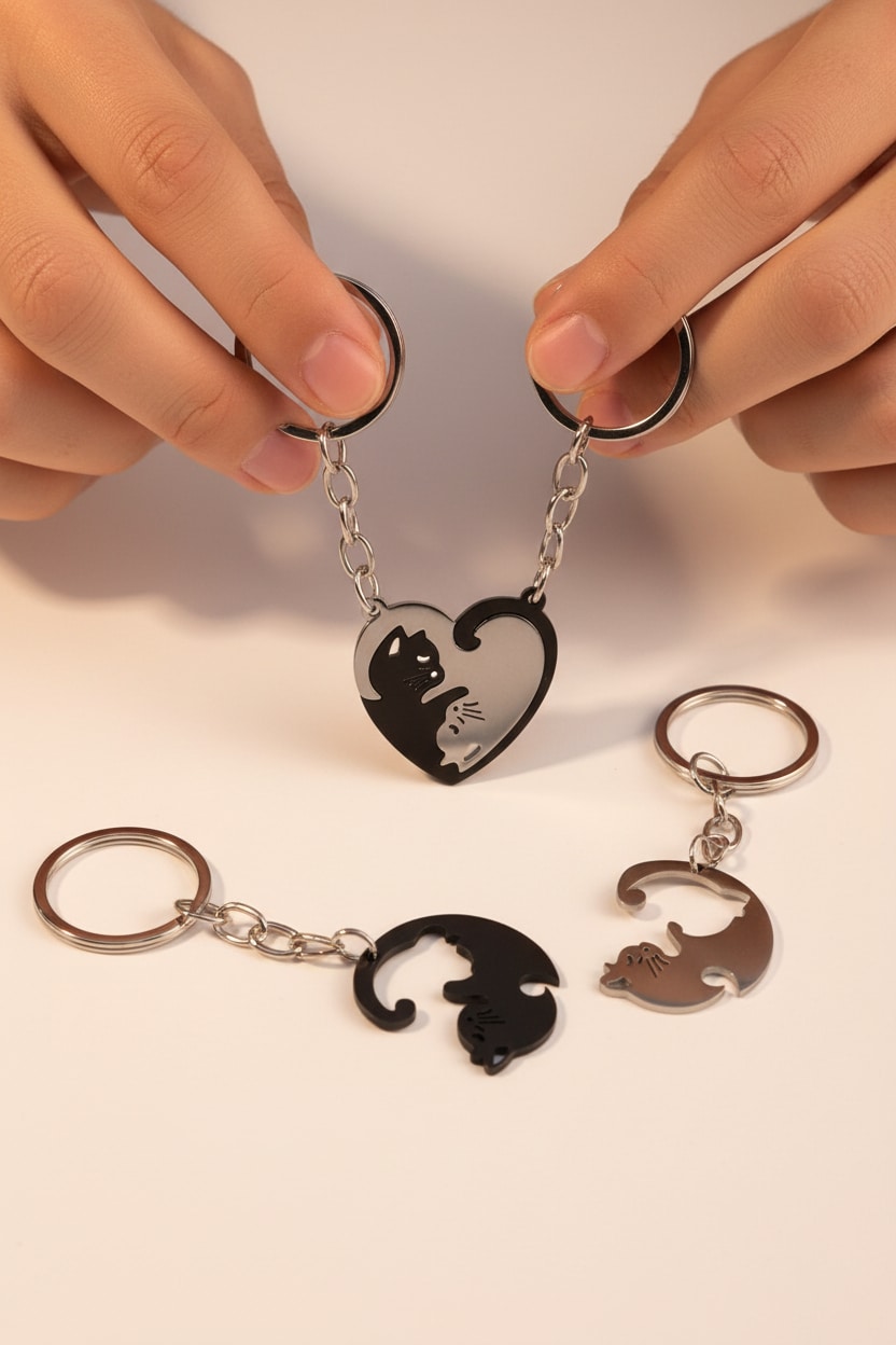 Sevimli kedi figür tasarımına sahip çift anahtarlık seti, birlikte kullanılan veya paylaşılabilen eğlenceli bir aksesuardır. Hafif ve dayanıklı yapısı sayesinde anahtar, çanta veya sırt çantasında rahatlıkla kullanılabilir. Günlük kullanım ve hediye için uygundur.