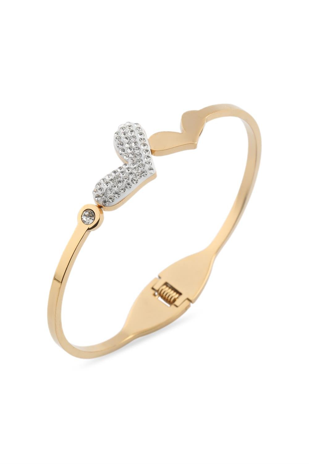 Taşlı Kalp Figürlü Altın Renkli Çelik Kelepçe Bileklik